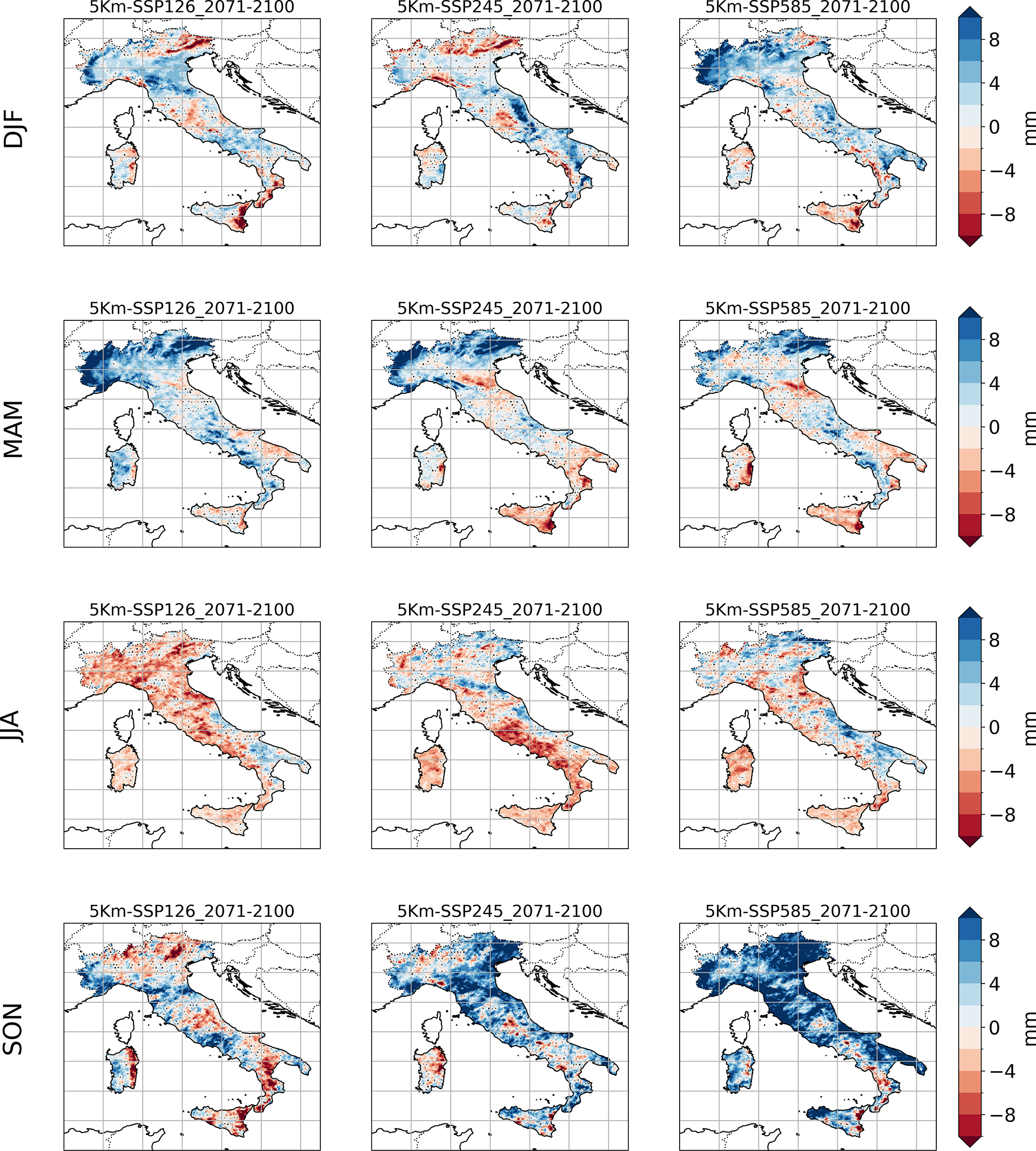 Tutti gli scenari prevedono entro la fine del secolo un riscaldamento generale e una intensificazione del ciclo idrologico con una riduzione media delle precipitazioni sulla regione mediterranea, accompagnata, sulla penisola italiana, da un forte aumento dell'intensità degli eventi estremi di precipitazione, particolarmente rilevanti per lo scenario ad alte emissioni durante l'autunno.